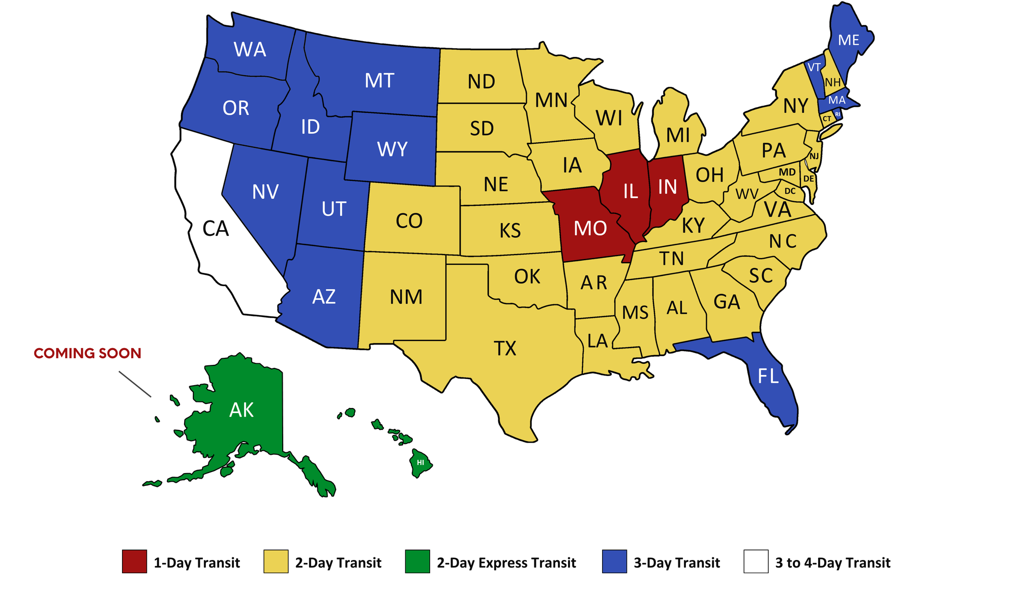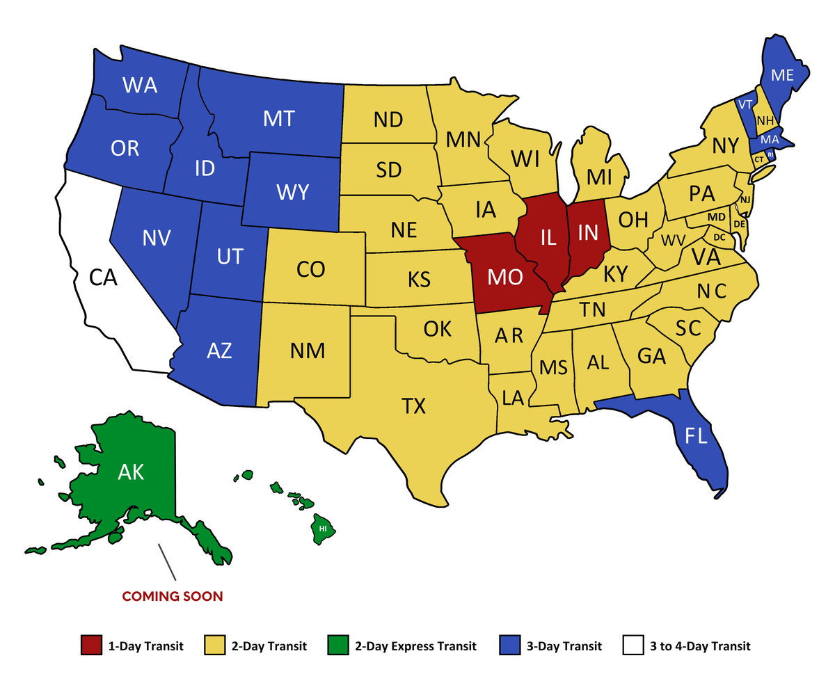 California Customers → Depending on where you’re located, deliveries may arrive on the 3rd or 4th transit day.